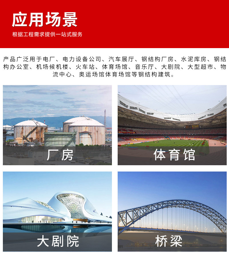 具有自重輕、強度高、鋼度大、防腐性好、抗震性強、耐火性佳、施工便捷、易于更新,同時符合國家倡導的節能、環保、安全要求。
